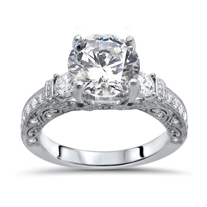 2.10ct Moissanite & Diamond 3 Stone Vintage Style Engagement Ring 18k White Gold