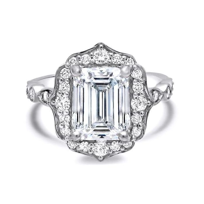 An excellent cut 8x6mm emerald cut moissanite (1.75ct Diamond Equivalent Weight) is placed atop this beautiful ring. Surrounding the solitaire are .36cts of sparkling round diamonds. This ring is crafted in 14k white gold and it has a 13.4mm width at its largest point along the finger. Accompanying this ring is a full independent gemological laboratory UGL diamond certificate as well as a separate Front Jewelers store appraisal. Both state its characteristics and reflect its appraisal value of $2,795. We offer a risk free 30 - day return policy which is detailed on our return policy page. Please feel free to ask any questions by email at Info@Frontjewelers.net or by phone Monday through Friday 10am - 5pm EST.