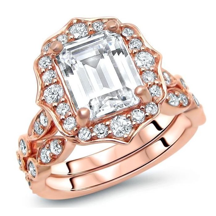 3.17ct Emerald Cut Moissanite Diamond Engagement Ring Bridal Set 14k Rose Gold (9x7mm)