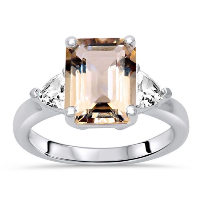 Aspen 3 Stone Trillion Cut White Sapphire Ring Set with 9x7mm Emerald Morganite 14k